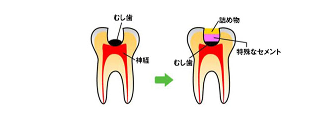 虫歯が進行すると、歯の神経近くまで達します。細心の注意を払いながら治療をするのですが、ケースによっては歯の神経が露出してしまう事があります。この場合、神経を除去する治療に移行するのですが、「IPC」や「MTAセメント」という素材を利用することで、歯の神経を保存することが可能になります。